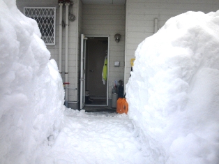 今日は屋根の雪おろしをして頂いております 通れるように排雪して頂きましたが おろした雪で裏口が一時通行止めになりました 雪の降らない所では想像がつかないかもしれませんが、 雪の重さで建物が潰れることがあるんです 今年は何回おろすのかな・・・ |