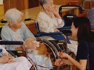 動物には人を癒す効果があるということは、以前から耳にしたことがありました。今回実際来園いただいて、利用者の皆さん方のなんとも言い難い笑顔を見た時、「ああ、これなんだなあ。」としみじみ実感しました。普段私たちが引き出せないような微笑み、瞳の柔らかさ。中には動物が苦手だと言っていたにもかかわらず、動物たちが近寄ると思わず手を伸ばしている利用者や、動物が来園するのを心待ちにしているあまり犬を抱きしめて離さない利用者もおり、心温まるひとときを過ごさせていただきました。 |